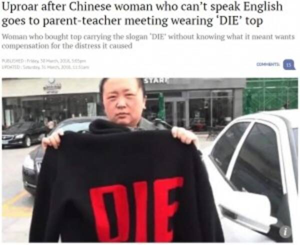 英語が分からず 死ね と書かれた服を保護者会に着て行った母親 中国 2018年4月7日 エキサイトニュース