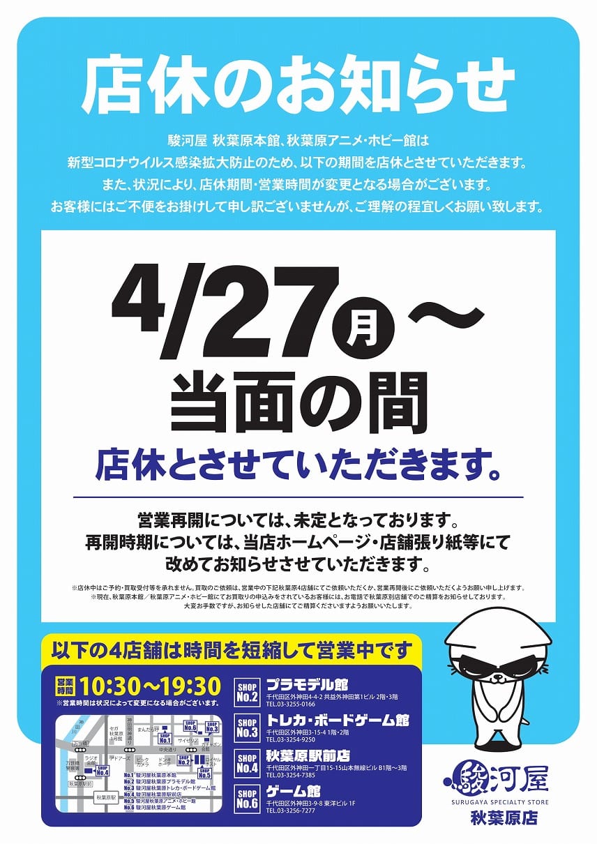 駿河屋 秋葉原店 アニメ ホビー館 On Twitter お知らせ つづき 4月27日以降も 秋葉原駅前店 トレカ ボードゲーム館 ゲーム館 プラモデル館 は時短にて営業を行います 状況により 営業時間等が変更になる場合がございます 駿河屋